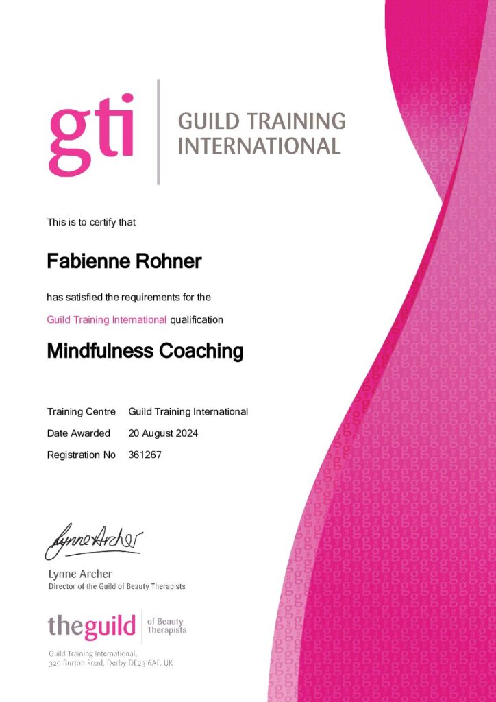 Im Jahr 2023 habe ich eine Weiterbildung in praktischer Psychologie abgeschlossen und 2024 meine Zertifikate im Life Coaching sowie Mindfulness Coaching erworben.